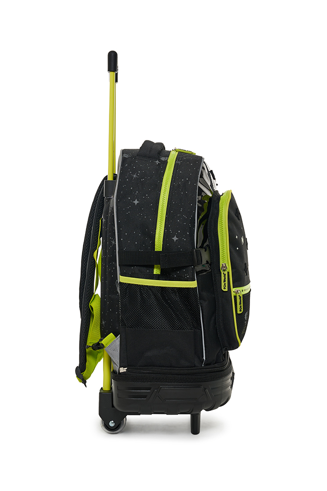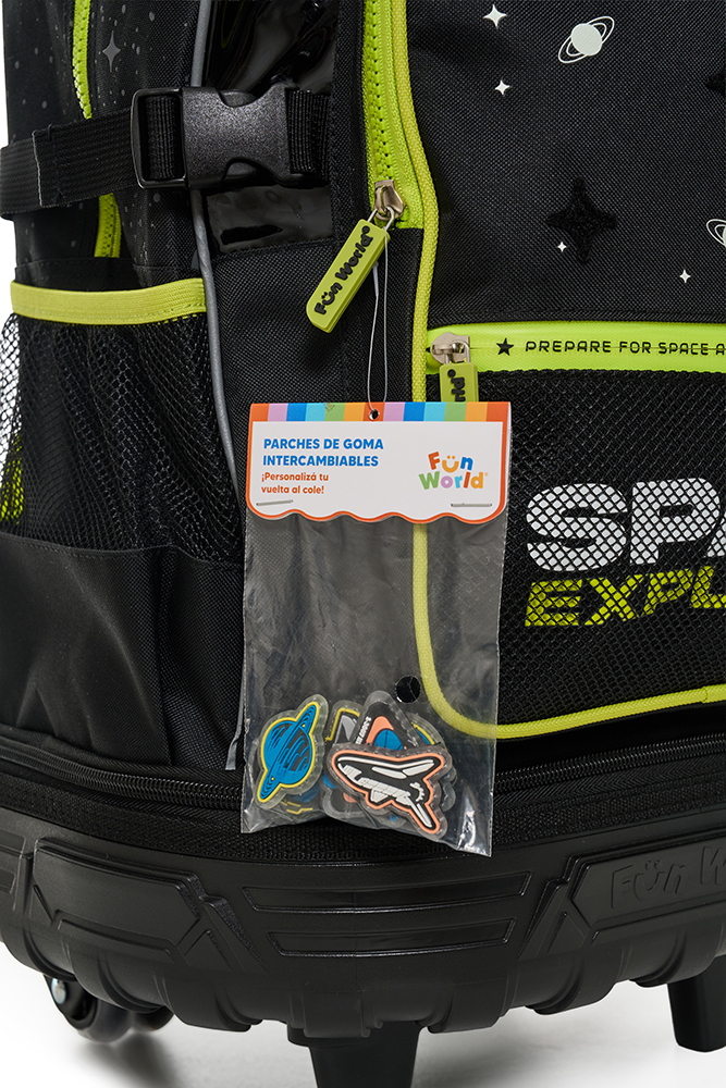 Con diseño moderno y detalles únicos, combina funcionalidad y estilo. Incluye parches de goma con velcro intercambiables, tinta que brilla en la oscuridad, bolsillo frontal con red y cierre impreso, además de varios bolsillos y compartimentos. Cuenta también con bolsillo lateral para colocar la botella.